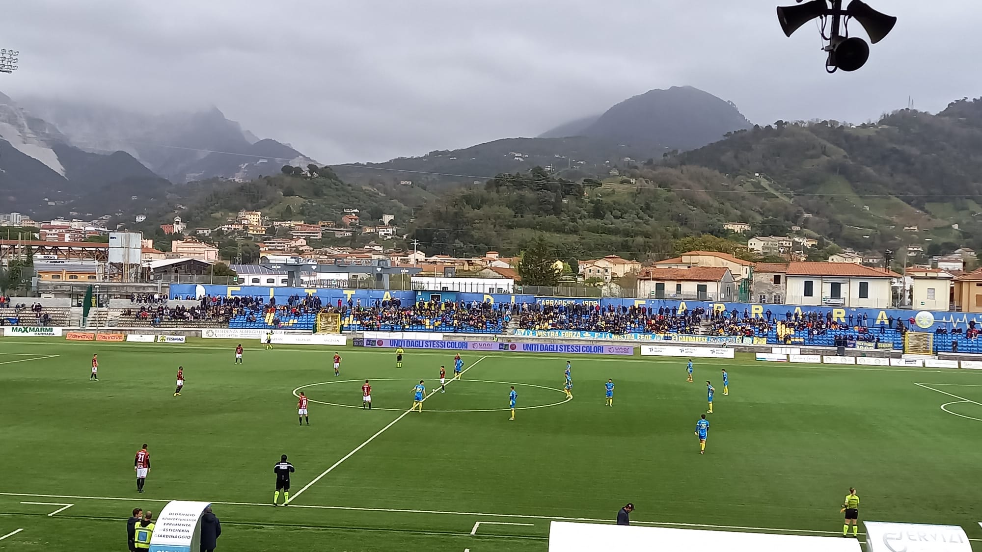 La Carrarese passa in vantaggio al 31' angolo di Semprini dalla destra, per Marino, che costringe Cucchietti alla respinta, la palla arriva a Rota, che questa volta di testa non sbaglia.