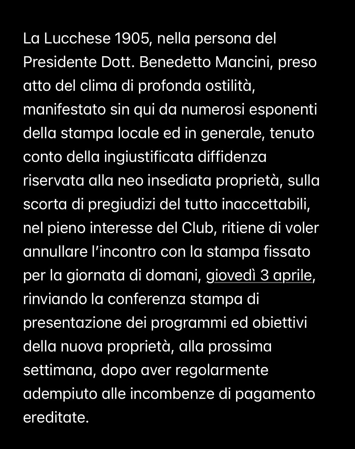 Per chi non lo sapesse questa mattina alle 10 si sarebbe dovuta tenere allo stadio Porta Elisa la più volte annunciata e rinviata conferenza stampa della nuova società per spiegare obiettivi e programmi in vista del nuovo anno. Peccato, però, che proprio l'altro giorno l'associazione italiana calciatori ha diffuso un comunicato in cui spiegava che i giocatori della Lucchese 1905 militante nel campionato di serie C entravano in stato di agitazione e che se prima del 5 aprile non fossero arrivati i soldi degli stipendi, nessuno sarebbe sceso in campo a Pontedera.