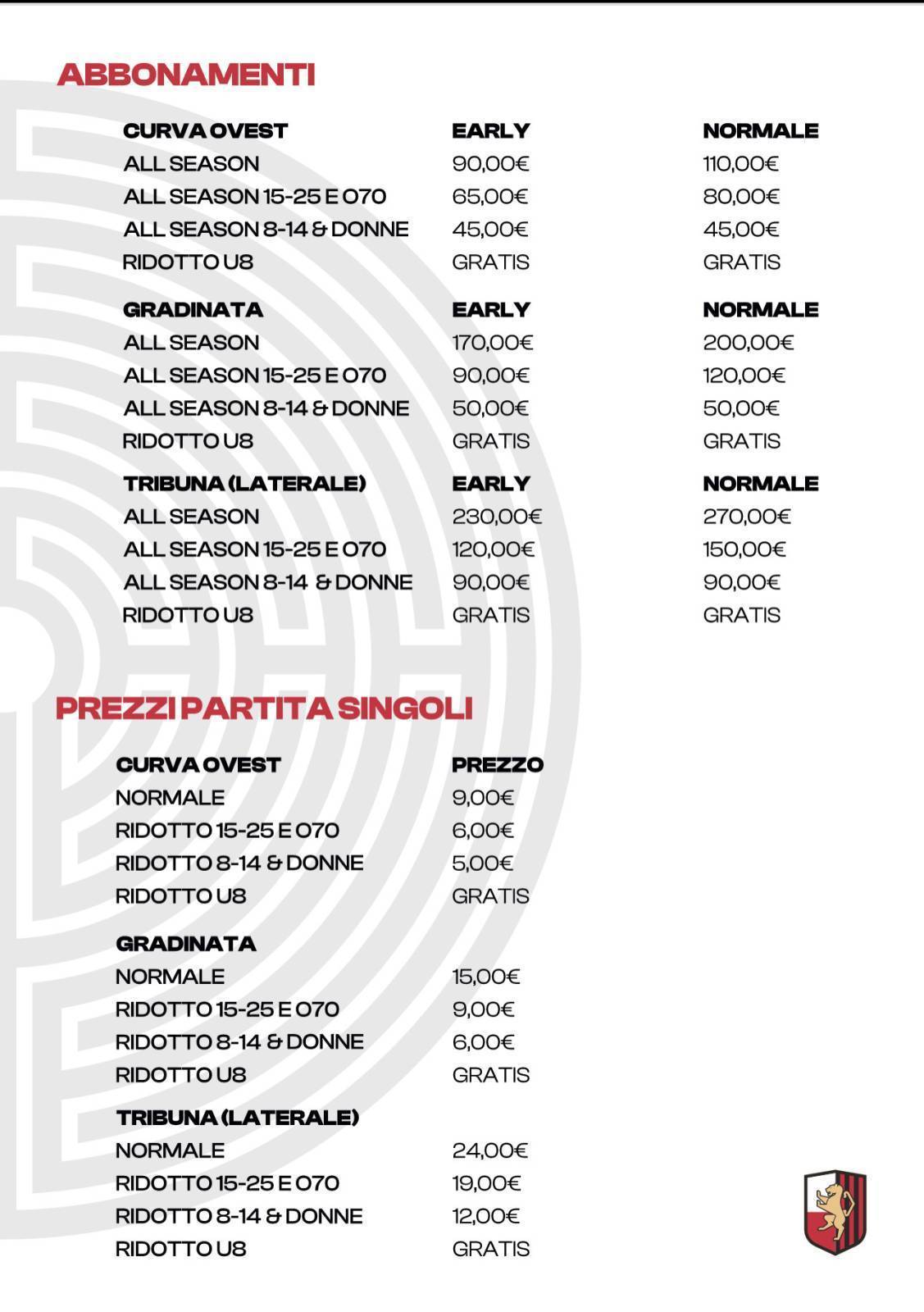 Per quanto riguarda gli abbonamenti invece, la scelta intrapresa è stata quella di abbassare genericamente tutti i prezzi. Per ogni tipo di abbonamento saranno infatti disponibili quattro frange di prezzo, relative a quattro categorie di età. Per i minori di otto anni l'ingresso rimarrà gratuito, mentre saranno disponibili sconti per i bambini dagli 8 ai 14 anni e per le donne (i cui biglietti costeranno circa la metà rispetto ad uno normale). Prezzi tagliati anche per i ragazzi dai 15 ai 25 e per gli over 70, ovviamente sia sui prezzi delle partite singole che sugli abbonamenti. Il quadro completo dei prezzi è consultabile tra le foto presenti a fine articolo e diventerà presto disponibile nei canali social dellaL ucchese 1905.