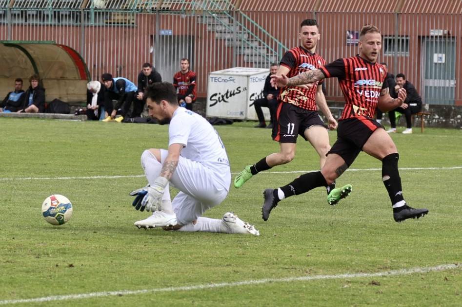 La Fermana risponde al 15' con Romeo, che sbaglia davanti alla porta. La partita dopo queste due occasioni non regala altri spunti interessanti. Si infiamma però il match al 23' con gli ospiti che riangono in inferiorità numerica per un fallo di De Nuzzo su Franco, sanzionato con il cartellino rosso.