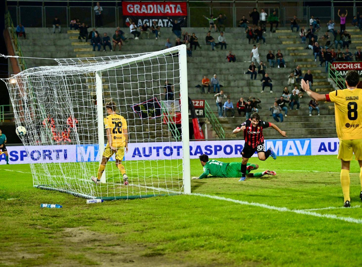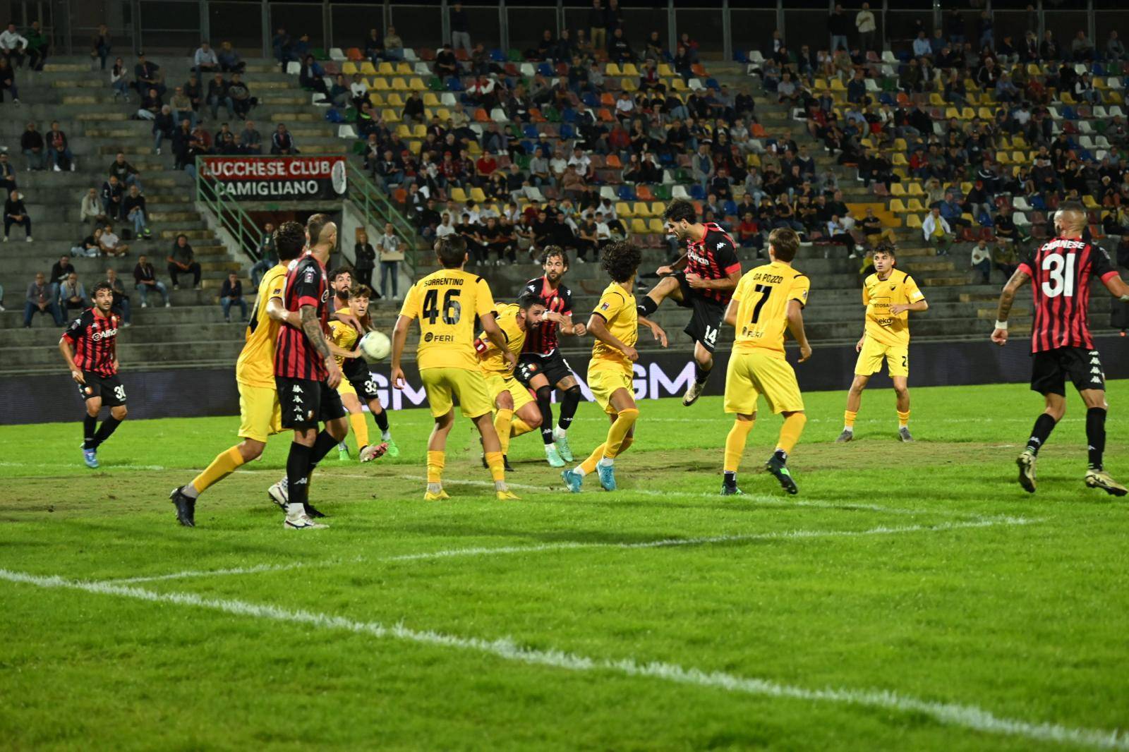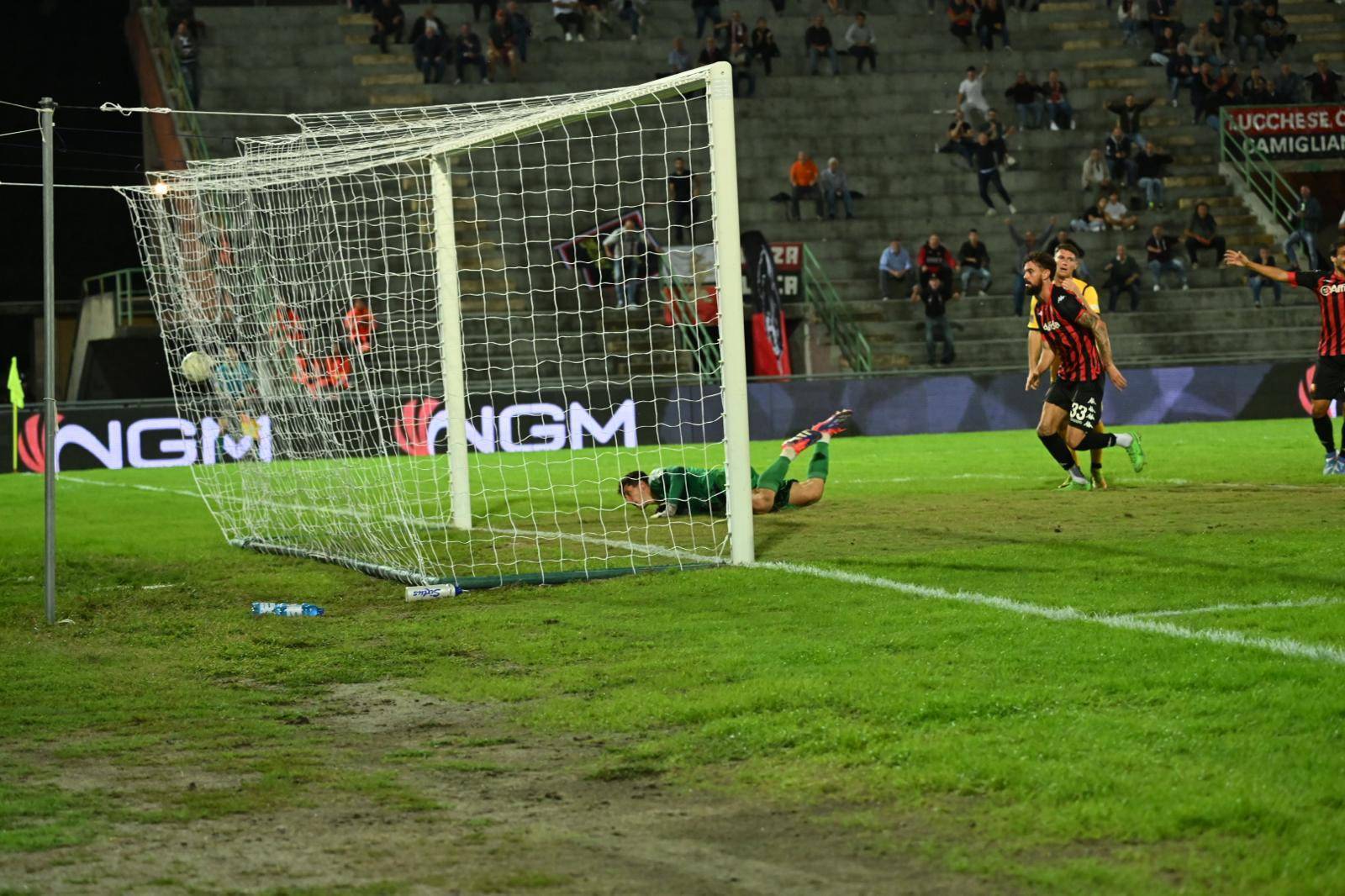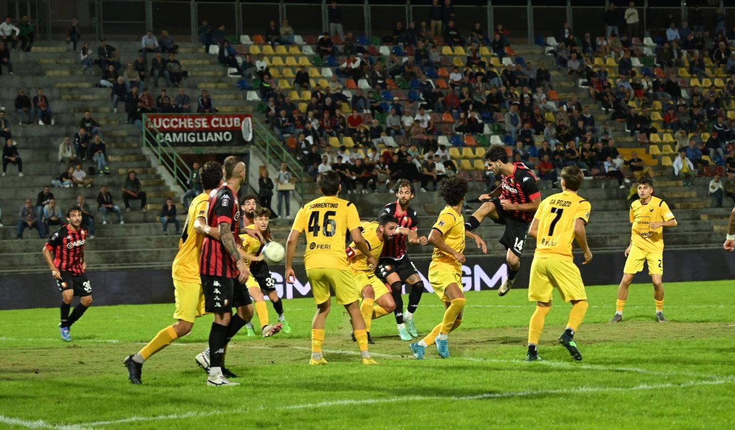 Partita importante per la Lucchese che cerca la prima vittoria tra le mura di casa. Di fronte la Pianese, una compagine, se pur neopromossa, con un buon inizio di campionato. Partenza guardinga per entrambe le formazioni con un leggero predominio territoriale da parte della squadra rossonera. La sensazione è che le squadre si stiano studiando. Al 13° Palmisani para basso su un tiro che controlla con attenzione. La Lucchese è abbondonata e la Pianese si dimostra squadra ben centrata. Fino al 20° nessuna emozione e domina un grande equilibrio. Al 25° del primo tempo, primo tiro in porta della Pianese che certifica un certo predominio territoriale nella metà campo della Lucchese. Al 27°, punizione sull’out di destra della porta difesa da Boer. Palla bassa e forte ma niente di fatto. La Lucchese avanza il baricentro. Al 30° punizione dalla tre quarti, Quirini rovescia ma non punge. La partita si apre ma adesso è la Lucchese che prova a fare la differenza con un atteggiamento più offensivo. Ed al 40° è la Lucchese che va vicinissima al gol con la traversa colpita da Antoni, con un gran colpo di testa che si stampa sulla traversa, su ottimo traversone di Gemignani. Ma quando meno te lo aspetti è la Pianese che, nel minuto di recupero si porta in vantaggio con Mignani, in sospetta posizione di fuorigioco, ma che l’arbitro convalida, nonostante le proteste di Tumbarello e compagni.