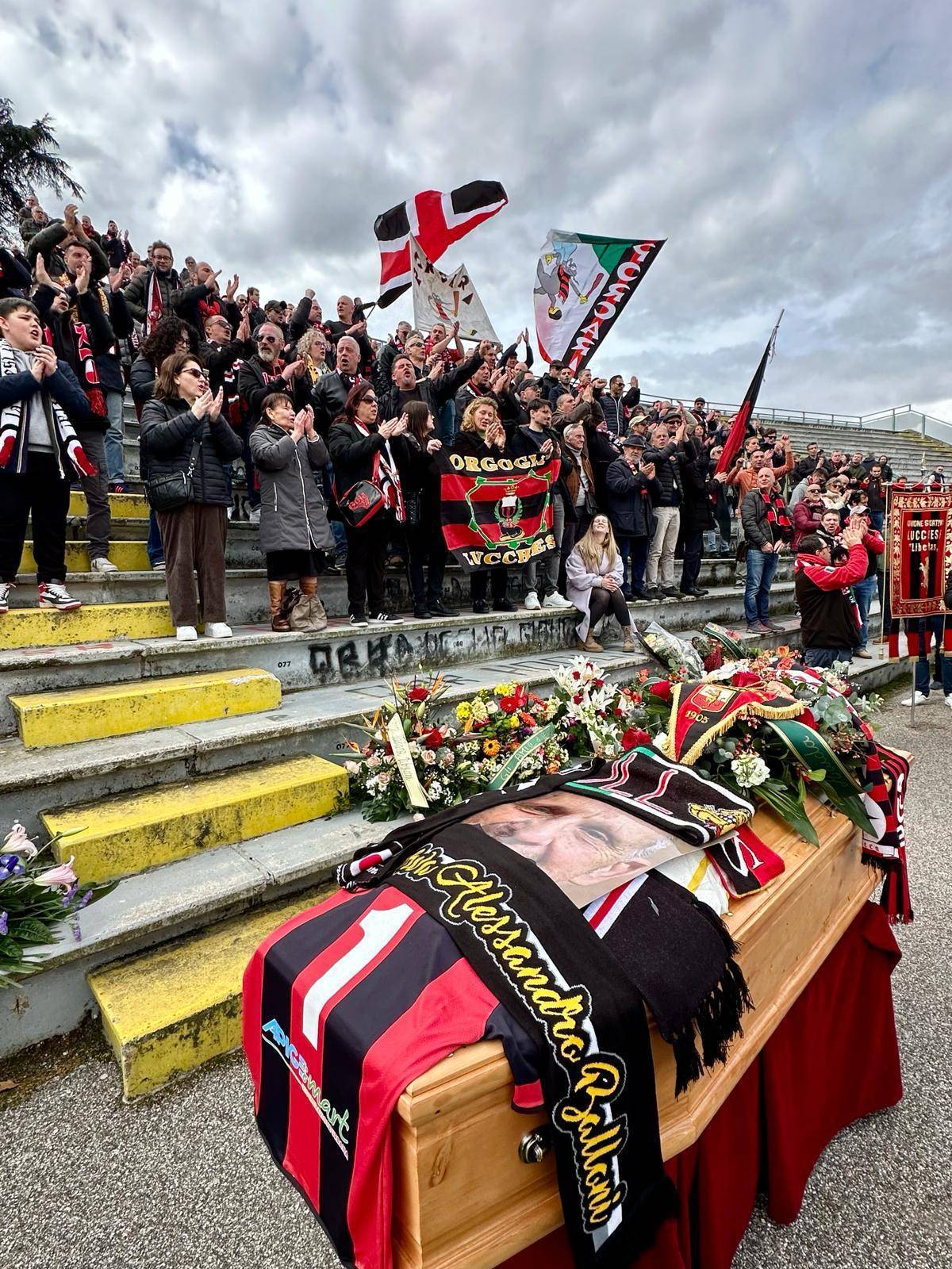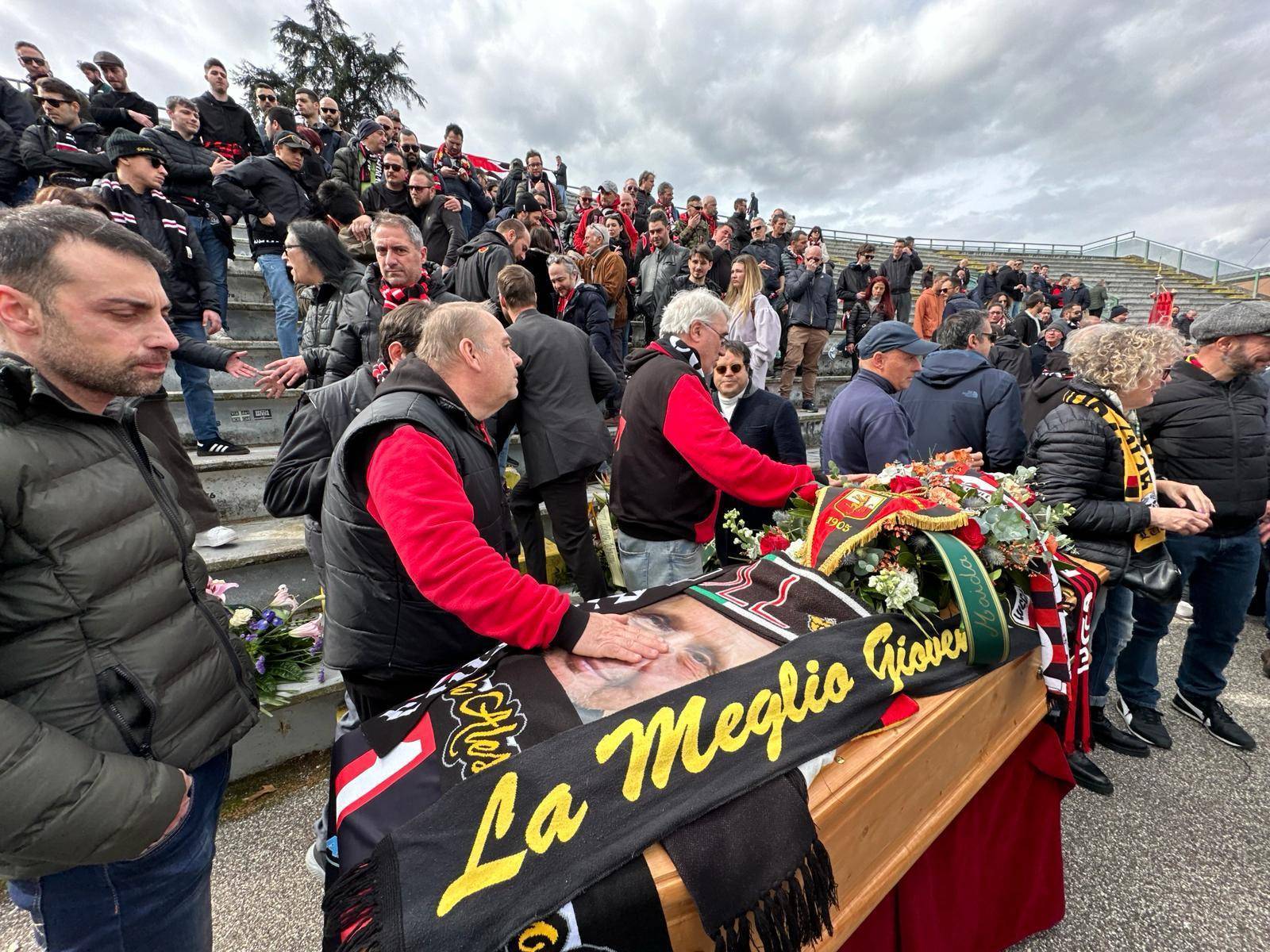 Una volta giunti allo stadio, ecco l'ingresso in curva Ovest dove un lungo striscione è stato esposto dai supporters rossoneri oltre a inni, cori all'infinito in onore di Beppe e un tifo che sembrava di essere, realmente, ad una partita di calcio. Applausi, la bara che è stata portata in spalla lungo tutto il percorso e anche sotto la curva in una sorta di pellegrinaggio a imperitura memoria. Sarebbe stato entusiasta Beppe, a vedere così tanta gente e tanto amore frutto di una vita spesa a inseguire i colori rossoneri.