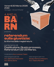 Venerdì 20 marzo, alle ore 21:30, presso il Circolo "Il Fienile" al Varignano, si terrà un incontro pubblico dedicato al tema del referendum sulla giustizia e alla riforma della magistratura, promosso dal gruppo informale di giovani 4AmicialBarn, composto da Cristiano Ceragioli, Andrea Pierini, Matteo Masotti, Davide Del Pistoia, Lorenzo Lo Porto e Matteo Maneschi.