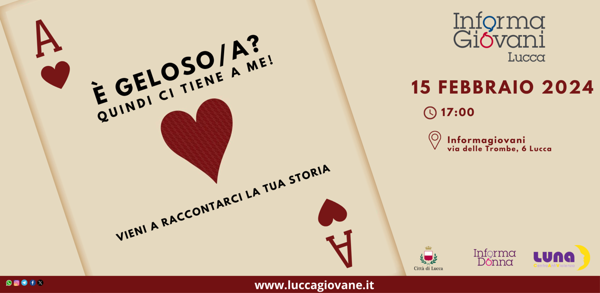 Informagiovani e Informadonna, in collaborazione con l’associazione Luna, organizza per giovedì 15 febbraio alle 17.00 un laboratorio partecipativo dal titolo “E’ geloso/a? Quindi ci tiene a me!”, rivolto a ragazze e ragazzi e in cui si potrà, partendo dalle storie di ciascuno, in un ambiente protetto e confidenziale, affrontare anche temi più scomodi quale la gelosia e i suoi confini.