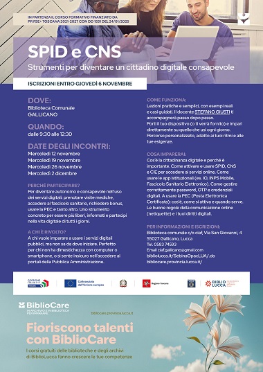 E' ancora possibile iscriversi al corso gratuito «Spid e Cns: strumenti per diventare un cittadino digitale consapevole» che si tiene dal 12 novembre a Gallicano nella Biblioteca comunale. Le iscrizioni a questo percorso formativo che rientra nel progetto della Provincia di Lucca, Bibliocare, sono aperte fino al 6 novembre.