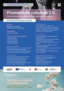 Ultimi giorni per l'iscrizione al corso gratuito «Promozione culturale 2.0: come utilizzare i media digitali per valorizzare la cultura», nato nell'ambito di Bibliocare che si svolgerà dal 29 settembre a Castelnuovo di Garfagnana, alla Biblioteca civica 'D. Pacchi': le iscrizioni, infatti, scadono il prossimo 21 ottobre.
