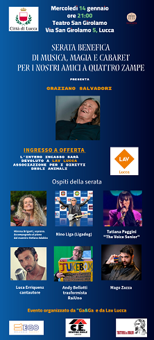 C'è grande attesa per lo spettacolo di mercoledì 14 gennaio alle 21 al teatro San Girolamo di Lucca a favore della LAV, l'associazione per i diritti degli animali.