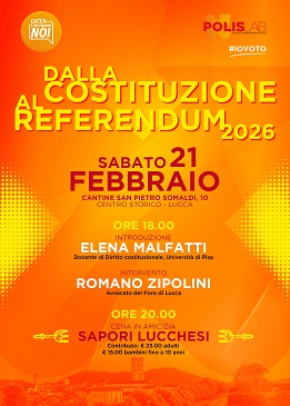 In un tempo in cui la comunicazione politica appare sempre più aggressiva e polarizzante, con il rischio di allontanare i cittadini dalla partecipazione e dal voto, l'associazione Lucca è un grande noi promuove un momento pubblico di riflessione e dialogo dal titolo "Dalla Costituzione al Referendum 2026", in programma sabato 21 febbraio alle ore 18.00 nelle cantine Carmassi di Piazza San Pietro Somaldi,10 in centro storico a Lucca.