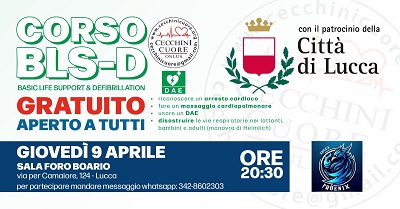 Il Comune di Lucca patrocina e promuove il corso gratuito di BLS-D (Basic Life Support & Defibrillation) organizzato da Cecchini Cuore ONLUS, un'importante iniziativa rivolta a tutta la cittadinanza con l'obiettivo di diffondere competenze fondamentali per il primo soccorso.