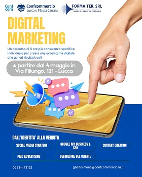 FormaTer, agenzia formativa di Confcommercio Lucca Massa Carrara, informa che sono aperte le iscrizioni per un nuovo corso di digital marketing, in programma nella sede di Lucca dell'associazione. Si tratta di un percorso di 8 ore, cui si aggiungerà anche una consulenza individuale per ciascuno dei partecipanti, che tratterà i seguenti argomenti: social media strategy, Seo, Google my business, content creation e paid advertising, all'insegna del percorso "dall'identità alla vendita". Le lezioni prenderanno il via lunedì 4 maggio: per maggiori info è possibile rivolgersi agli uffici Confcommercio (referente Simona Ghelfi, 0583/473152 -