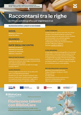 C'è invece tempo fino al 10 novembre per accedere agli incontri del corso «Raccontarsi tra le righe - Scrittura autobiografica per esprimere il sé», che si svolgerà alla Biblioteca comunale di Montecarlo.
