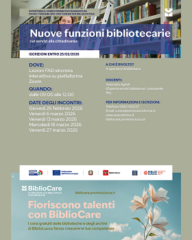 Anche la biblioteca cambia e diventa sempre più attuale, andando a rispondere ai bisogni di una società in continuo mutamento. Per restare al passo con i tempi, quindi, è necessaria una formazione che vada oltre gli scaffali e i prestiti. A questo ci pensa il corso gratuito «Nuove funzioni bibliotecarie nei servizi alla cittadinanza», nato nell'ambito di Bibliocare, il progetto della Provincia di Lucca che prenderà il via il 26 febbraio prossimo su piattaforma Zoom.