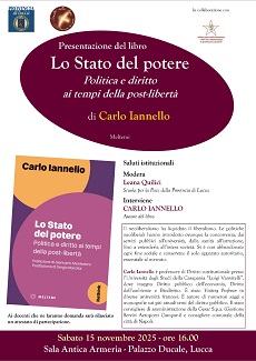 L'Antica Armeria di Palazzo Ducale, sabato 15 novembre ospita, a partire dalle 16, la presentazione del libro «Lo stato del potere - Politica e diritto ai tempi della post-libertà» di Carlo Iannello (ed. Meletemi), organizzato dalla Scuola per la Pace della Provincia di Lucca in collaborazione con l'Istituto storico della Resistenza e dell'Età contemporanea di Lucca.