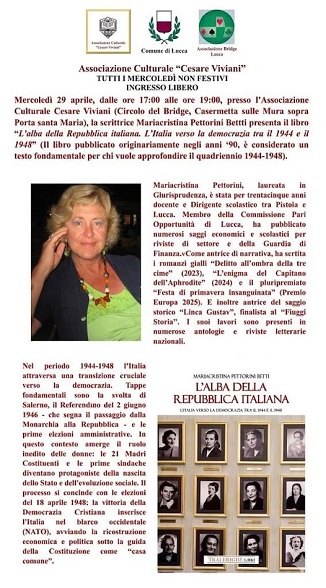 Mercoledì 29 aprile, dalle ore 17:00 alle ore 19:00, presso l’Associazione Culturale Cesare Viviani (Circolo del Bridge, Casermetta sulle Mura sopra Porta Santa Maria), la scrittrice Mariacristina Pettorini Bettti presenta il libro “L’alba della Repubblica italiana. L’Italia verso la democrazia tra il 1944 e il 1948” (Il libro  è considerato un testo fondamentale per chi vuole approfondire il quadriennio 1944-1948).