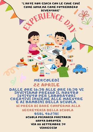 La Scuola primaria "Santa Dorotea" di Viareggio (Via XX Settembre 39) apre le sue porte alla creatività con "Experience Day", un pomeriggio speciale dedicato ai più piccoli e alle loro famiglie.