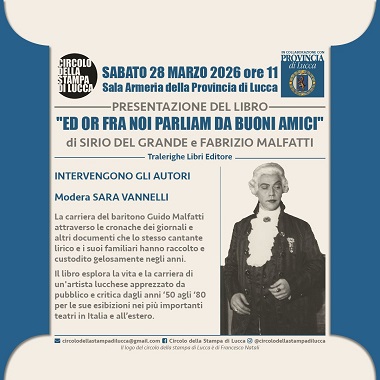 Il volume "Ed or fra noi parliam da buoni amici - Guido Malfatti, orgoglio lucchese. Un grande baritono cittadino del mondo", scritto a quattro mani dal giornalista Sirio Del Grande e da Fabrizio Malfatti, figlio dell'artista, ed edito da Tralerighe Libri. L'incontro, moderato da Sara Vannelli, è organizzato dal Circolo della Stampa di Lucca nella rassegna "Pila di Libri", in collaborazione con la Provincia di Lucca.