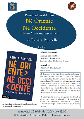 Come approcciarsi al nuovo mondo che sta prendendo forma giorno dopo giorno di fronte ai nostri occhi? Una domanda alla quale, mercoledì 25 febbraio, a partire dalle 17, nell'Antica Armeria di Palazzo Ducale, quando Renata Pepicelli presenterà il suo libro 'Né Oriente, né Occidente - Vivere un mondo nuovo' (Ed. Il Mulino), dialogandone con Antonio Chiaravalloti della Scuola per la Pace della Provincia di Lucca.