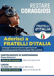 Domani, giovedì 20 novembre e sabato 22 novembre torna la campagna tesseramento FDI 2025 "Restare Coraggiosi" a Castelnuovo di Garfagnana e Lucca. Dopo l'ottimo risultato ottenuto da Fratelli d'Italia nella provincia di Lucca alle elezioni Regionali che ha portato all'elezione di Vittorio Fantozzi in Consiglio Regionale, dove siederà nell'Ufficio di Presidenza, Fratelli d'Italia torna tra i cittadini con la campagna di tesseramento: "Il nome della campagna di tesseramento è un invito a continuare a stare al fianco del partito per raggiungere insieme i tanti obiettivi che ci siamo dati. Il nostro intento - spiega il Presidente Provinciale FDI Riccardo Giannoni - è quello di far conoscere a più persone possibili il progetto politico di Fratelli d'Italia, perché possano abbracciarlo e sostenerlo in modo consapevole e attivo. La scarsa affluenza alle urne ci spinge a lavorare perché i cittadini possano tornare a partecipare con convinzione alla vita democratica del paese. L'adesione ad un partito è sicuramente un elemento importante per dare il proprio contributo alla costruzione delle buone politiche sul territorio e a disegnare il futuro delle nostre comunità. Oltre a questo, entrare a far parte di Fratelli d'Italia può essere un gesto concreto di sostegno e supporto all'azione che sta portando avanti il governo nazionale guidato da Giorgia Meloni".