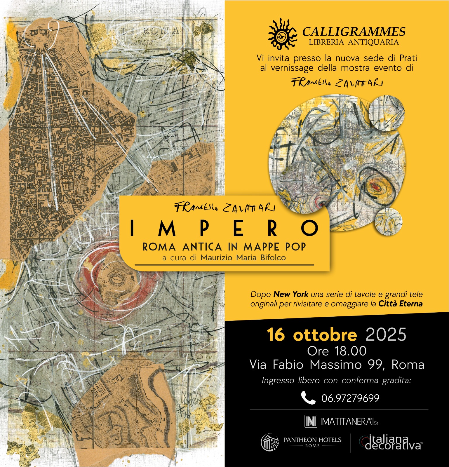 Dopo l’esperienza di New York, Francesco Zavattari presenta a Roma un progetto analogo e inedito che ne riafferma la ricerca artistica legata al dialogo tra passato e contemporaneità. La mostra “Impero – Roma antica in mappe Pop”, curata da Maurizio Maria Bifolco, inaugura giovedì 16 ottobre 2025 alle ore 18.00 presso la Libreria Antiquaria Calligrammes in via Fabio Massimo 99, nuova sede che si affianca a quella storica di Corso Rinascimento.