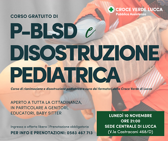 Una serata insieme, per imparare a salvare una vita: la Croce Verde di Lucca organizza una lezione serale sulla disostruzione delle vie aeree in età pediatrica, rivolta a tutta la cittadinanza, in special modo a genitori, educatori e baby sitter. L’appuntamento è per lunedì 10 novembre, alle ore 21:00, presso la sede centrale dell’Associazione (v.le Castracani 468/D).