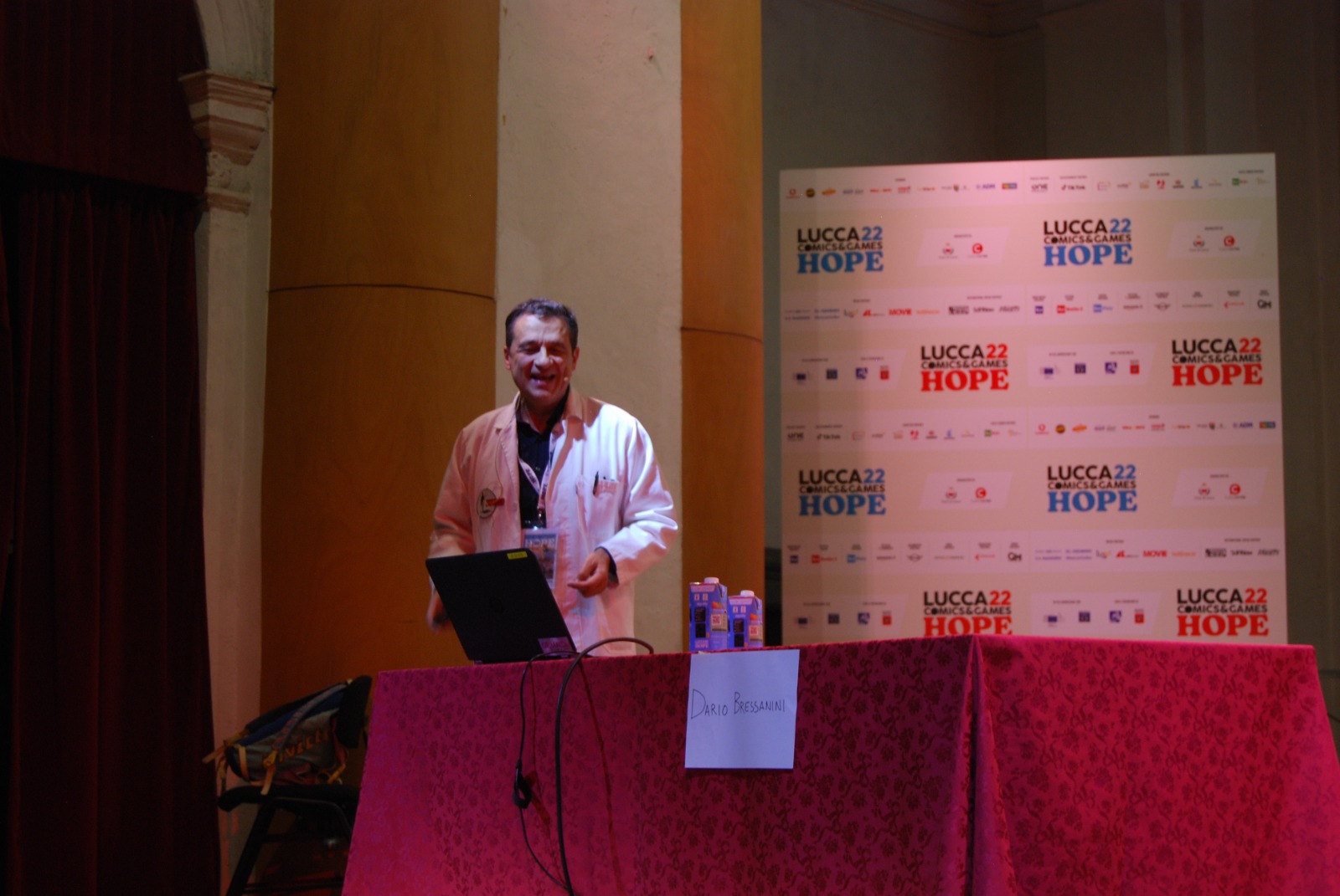 Nella conferenza tenutasi oggi alle 17 all'interno dell'Auditorium del Suffragio vicino a Piazza Bernardini, in pieno stile Lucca Comics&Games il noto divulgatore, come suo solito, ha unito il regno delle scienze con quello dei fumetti, dedicandosi in particolare agli albi della Golden e della Silver Age americana.