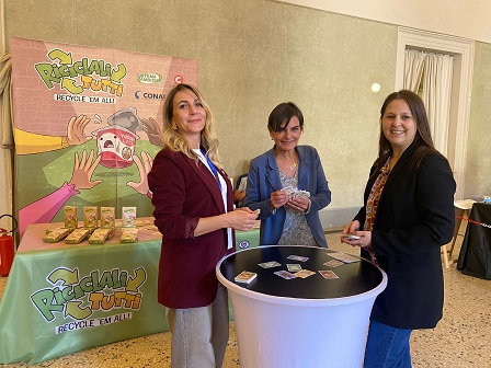 Gli assessori Cristina Consani e Simona Testaferrata, insieme alla presidente di Sistema Ambiente hanno provato il gioco a Lucca Comics & Games.