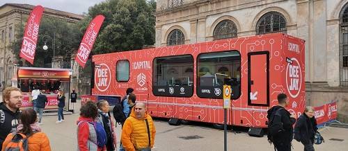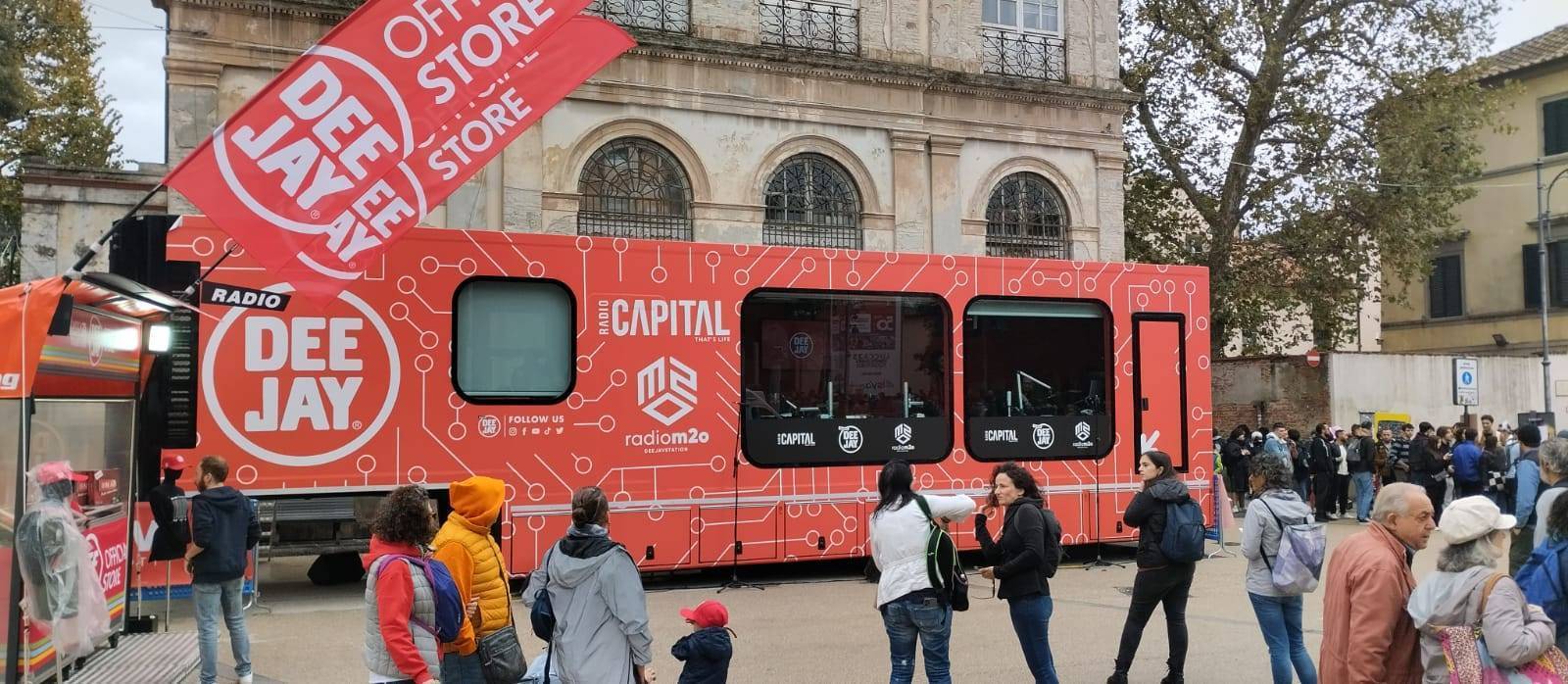 Per la prima volta sbarca a Lucca la squadra di Radio Deejay, e lo fa letteralmente all’interno del rosso truck, o studio mobile, posizionato in piazzale Verdi. Il famoso team di “Deejay chiama Italia”, capitanato da Pasquale di Molfetta, in arte Linus, affiancato dall’immancabile Nicola Savino, nato tra l’altro proprio a Lucca, ha iniziato la diretta, nella giornata inaugurale dell’attesa kermesse mondiale, quando l’afflusso ai padiglioni, ed in particolare quello della Panini a pochi metri di distanza, era già imponente.