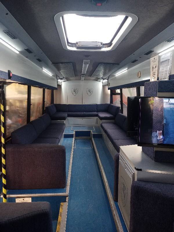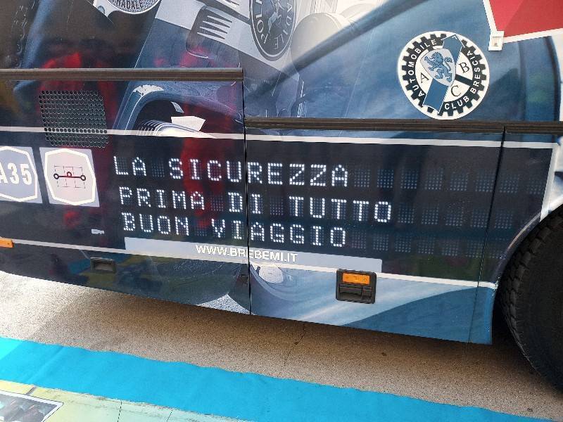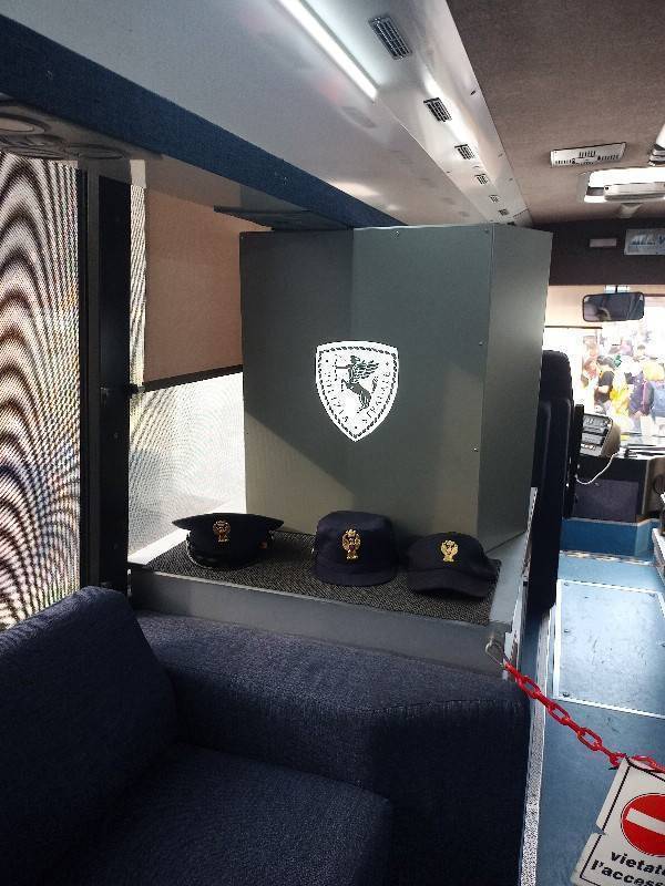 Imponente e con la sua magnificenza il "pullman azzurro", utilizzato per tour a ciclo continuo in giro per l'Italia a fare formazione ed informazione nelle scuole, soprattutto per la sicurezza stradale. "Il nostro scopo è quello di insegnare le buone regole alla popolazione scolastica per ciò che riguarda la circolazione su strada" - racconta uno degli agenti addetti.