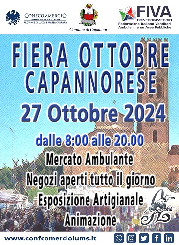 Appuntamento da non perdere domenica prossima 27 ottobre con la tradizionale Fiera dell'Ottobre Capannorese. L'evento, a cura di Confcommercio e del suo sindacato Fiva dei venditori ambulanti, è organizzato in collaborazione con il Comune e in programma nel capoluogo, che vedrà fin dal mattino e per tutta la giornata la presenza di decine di banchi provenienti da tutta la Toscana che metteranno in vendita i più svariati generi merceologici all'insegna della qualità. Al mercato ambulante si affiancheranno animazione e l'apertura dei negozi, con la presenza anche di stand con prodotti dell'artigianato a cura degli Artigiani e Artisti di Pandora. Gli organizzatori ricordano a tutti gli interessati l'ampia disponibilità di parcheggi gratuiti nelle vicinanze della fiera.