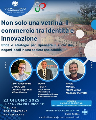 "Non solo una vetrina: il commercio tra identità e innovazione". E' questo il titolo dell'importante convegno organizzato da Confcommercio Province di Lucca e Massa Carrara, in programma lunedì 23 giugno a Palazzo Sani, sede lucchese dell'associazione. Una giornata a ingresso libero per il pubblico che metterà al centro della discussione sfide e strategie per ripensare il ruolo dei negozi locali in una società che cambia. A partire dalle 9,30 è prevista la registrazione dei partecipanti, seguita alle 10 dall'inizio dei lavori: a prendere la parola, moderati dal vicepresidente di Confcommercio Province di Lucca e Massa Carrara Samuele Cosentino, saranno Alessandro Capocchi – professore dell'Università degli Studi Milano Bicocca; Paolo Testa – responsabile settore urbanistica e rigenerazione urbana di Confcommercio Italia; Nicola Minelli – Iscom Group manager distretto. "Da tempo – afferma Cosentino – la nostra Associazione insiste sul tema del rilancio del commercio di prossimità, individuandolo come una "maglia" indispensabile della rete sociale, che in una comunità inevitabilmente e naturalmente si crea. Il negozio di vicinato non è solo una vetrina, è un luogo sicuro, un occhio vigile, una luce accesa, un archivio storico di quartiere". "Temi – aggiunge il vicepresidente di Confcommercio – che abbiamo avuto modo di esporre pubblicamente a più riprese anche negli ultimi mesi, con le nostre partecipazioni ad esempio agli Stati Generali del turismo promossi dal Comune di Lucca dello scorso ottobre, o al convegno di sabato scorso su economia e turismo all'interno del Museo della Zecca. Temi decisivi, a nostro avviso, per il futuro della città e del nostro intero territorio". "Ecco dunque – chiude Cosentino – l'idea di organizzare una giornata a firma Confcommercio che possa lanciare ulteriori spunti a enti e istituzioni per strategie future, grazie alla presenza di esperti qualificati in grado di fornire spaccati puntuali in materia urbanistica ed economica. Insomma, un'occasione di riflessione da non perdere, per la quale auspichiamo una massiccia adesione da parte di operatori, addetti ai lavori e amministratori". Per ulteriori info è possibile contattare la segretaria organizzativa dell'evento (Martina Carnicelli –