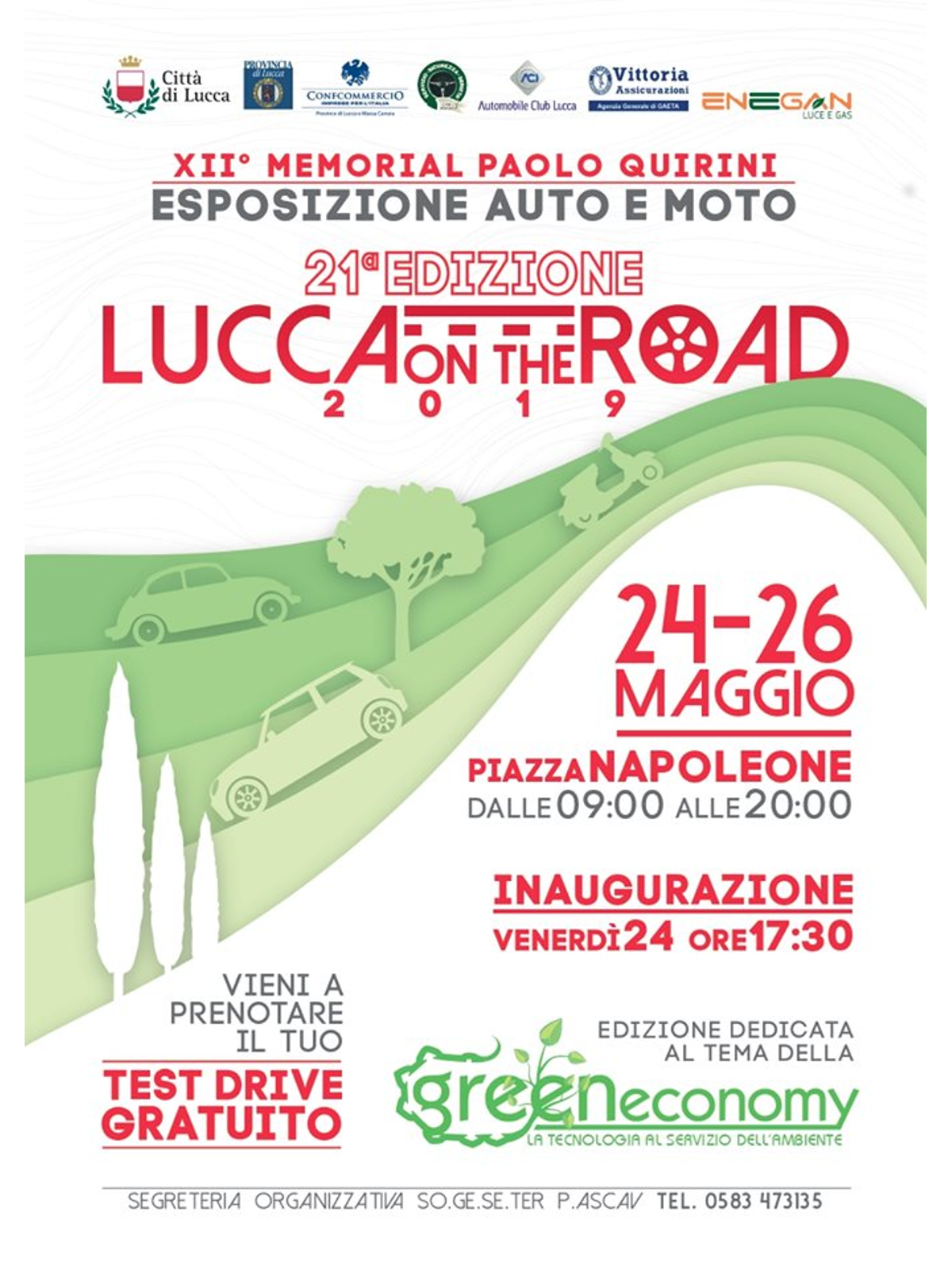 Torna quest'anno dopo la lunga "pausa" imposta dall'emergenza covid il tradizionale appuntamento con "Lucca On the road", esposizione di automobili e moto giunta alla sua ventiduesima edizione e in programma da venerdì 26 a domenica 28 maggio all'interno di piazza Napoleone. L'evento è organizzato da Confcommercio, in collaborazione con il proprio sindacato Ascav dei concessionari di auto e moto e il patrocinio di Centro commerciale Città di Lucca, Comune, Provincia e Aci, e i contributi di Camera di Commercio Toscana Nord Ovest e Enegan. L'appuntamento con il taglio del nastro è previsto per venerdì alle 17,30, dopo di che l'esposizione sarà visitabile sino alle 20. Nei giorni di sabato e domenica, invece, appuntamento dalle 9 alle 20. All'interno della "Lucca On The Road" è previsto anche lo svolgimento della tredicesima edizione del Memorial "Paolo Quirini". "Green Economy - riduzione dei consumi e più rispetto dell'ambiente": questo il tema di quest'anno, con possibilità per i partecipanti di prenotare un test drive gratuito e, grazie alle partnership con Enegan, di vedere il funzionamento della ricarica dei motori ibridi elettrici.