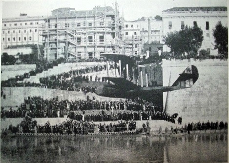 Il 7 novembre 1925 intorno alle ore 15, l’idrovolante con Francesco De Pinedo ed Ernesto Campanelli, che ha sorvolato tre continenti per complessivi 55.000 chilometri ammara nel Fiume Tevere nei pressi di Ponte Ripetta. La folla è immensa e da allora quel luogo sarà chiamato “Scalo De Pinedo”, si compie così una delle più grandi imprese dell’Aeronautica Italiana, un record mondiale, un passo verso il progresso e l’unione tra i popoli.