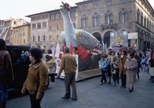 La storia del Carnevalfratta. Sono passati quasi cinquant'anni dal 25 febbraio 1979, prima edizione del Carnevalfratta. La festa nacque come una vera e propria iniziativa di quartiere durante la quale tutti davano il proprio contributo: tra cibo, maschere improvvisate e pensate, spettacoli teatrali e carri rionali di cartapesta, il Carnevalfratta invadeva - e invade - con le sue onde colorate e goliardiche tutto il quartiere della Fratta, del Bastardo e, ovviamente, piazza San Francesco. Tante persone hanno animato questa festa 'corale': negli anni, nei locali dell'ex cinema Eden (oggi ingresso IMT), hanno preso vita il laboratorio delle maschere, quello delle installazioni di cartapesta e l'angolo dei vestiti. E poi gli spettacoli, le installazioni, la comunità che si ritrova e partecipa. Memorabile fu, un anno, l'arrivo di sessanta maschere di Pulcinella direttamente da Avellino a testimonianza del fatto che il CarnevalFratta ha da sempre avuto una connotazione capace di superare i confini della città.