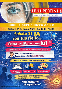 Sabato 31 gennaio dalle ore 15 alle ore 17 si svolgerà presso la sede centrale dell'ISI Pertini in Viale Cavour 267 una conferenza divulgatoria sul tema dell'uso della AI nella scuola dal titolo "Parla di IA con tuo figlio, prima che l’IA parli con lui".