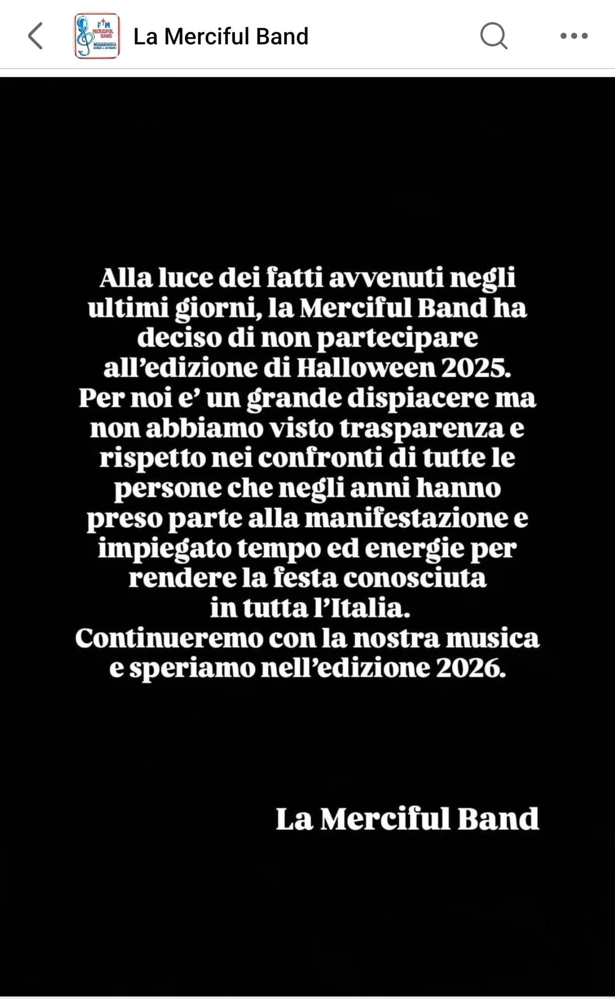 Adesso, anche la Merciful Band – banda della locale Misericordia – ha deciso di non esserci, affidando il suo amaro annuncio ad un post social.