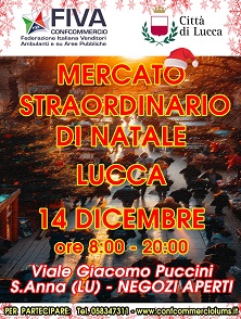 Domenica 14 dicembre lungo il viale Puccini appuntamento da non perdere con il mercato straordinario di Natale nel quartiere di Sant'Anna organizzato da Fiva Confcommercio Lucca, il sindacato dei venditori ambulanti, con il patrocinio del Comune. Dalle 8 alle 20 una occasione di shopping natalizio tra i banchi ma anche nelle attività a posto fisso che resteranno aperte tutto il giorno, a prosecuzione di un rapporto di storica collaborazione con i propri colleghi ambulanti. Presenti alcune decine di banchi provenienti da varie zone della Toscana, che metteranno in vendita i più svariati generi merceologici all'insegna della qualità. Confcommercio sottolinea anche la possibilità per il pubblico di poter usufruire di numerosi e comodi parcheggi nelle vicinanze del viale.