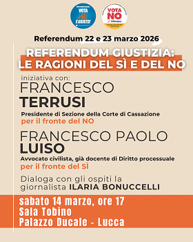 Un confronto aperto e pubblico per approfondire i contenuti e le implicazioni del referendum sulla giustizia in programma il 22 e 23 marzo 2026. È questo l'obiettivo dell'incontro dal titolo "Referendum Giustizia: le ragioni del Sì e del No", che si terrà sabato 14 marzo alle 17 nella Sala Tobino di Palazzo Ducale a Lucca.