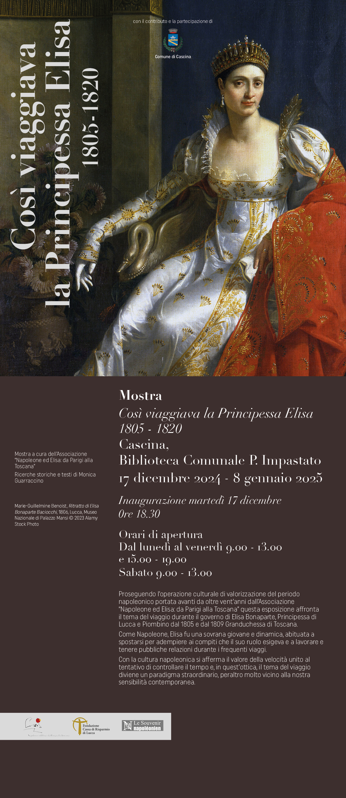 Da Lucca a Cascina: apre martedì 17 dicembre 2024 alle 18,30 nella biblioteca comunale Peppino Impastato di Cascina, la mostra "Così viaggiava la Principessa Elisa. 1805-1820". L'esposizione organizzata dall'associazione "Napoleone ed Elisa: da Parigi alla Toscana" a Villa Bottini nell'agosto 2023 con il contributo del Comune di Lucca nel calendario di "Vivi Lucca", realizzata in collaborazione con Le Souvenir Napoléonien e con il contributo della Fondazione Cassa di Risparmio di Lucca, con le ricerche storiche e i testi di Monica Guarraccino, si arricchisce infatti di pannelli dedicati al transito della sovrana nella città di Cascina.