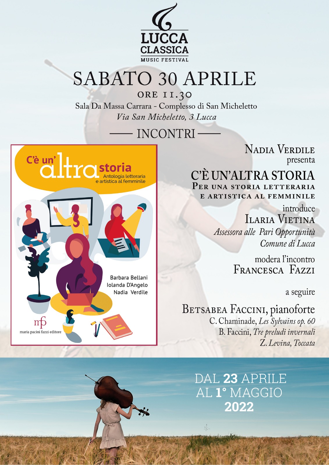 Lucca Classica è donna: sabato 30 aprile alle 11.30 nella Sala Da Massa Carrara del Complesso di San Micheletto incontro con Nadia Verdile. Per parlare di arte, scrittura e musica... al femminile. In occasione dell'edizione dell'Antologia "C'è un'altra storia. Antologia letteraria e artistica al femminile" (Pacini Fazzi editore) scritto dalla stessa Verdile con Barbara Bellani e Iolanda D'Angelo e con la prefazione dell'Assessora Regionale Alessandra Nardini. Nadia Verdile ci propone un excursus fra le tante compositrici italiane, dal Medioevo ai giorni nostri, troppo spesso dimenticate. E in chiusura l'omaggio della pianista Betsabea FACCINI che ci farà ascoltare i brani di 3 autrici contemporanee. Lei stessa (B. Faccini), Cécile Chaminade (Parigi 1857 - 1944) definita da Bizet "il mio piccolo Mozart" e in chiusura Zara Levina (1906 - 1976), autrice ucraina, diplomatasi al Conservatorio di Odessa.