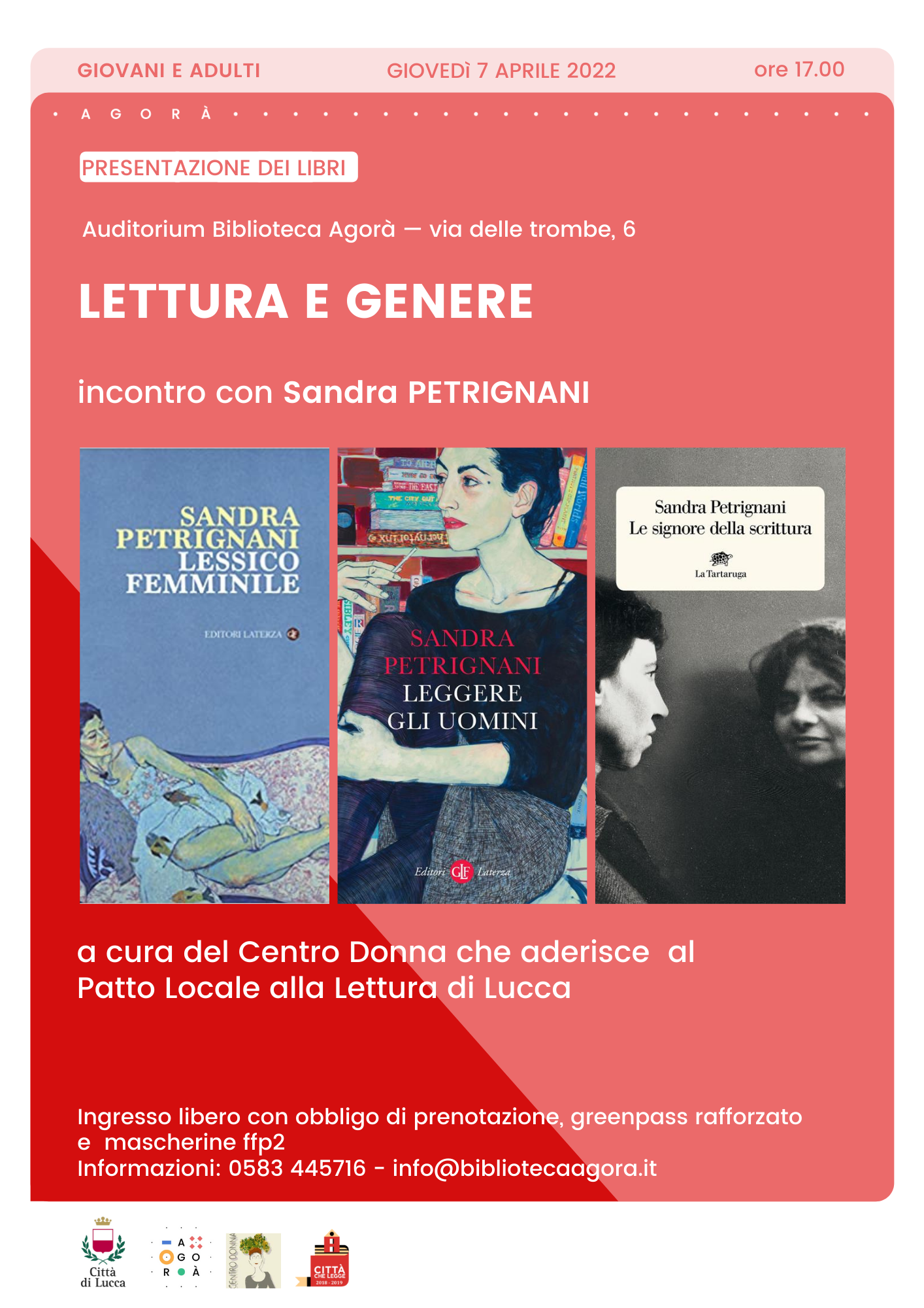 Il Centro Donna Lucca, aderendo al Patto Locale per la Lettura di Lucca, organizza un incontro su lettura e genere giovedì 7 aprile alle 17 presso l'auditorium della biblioteca Agorà in via Delle Trombe 6, Lucca. Sarà presente la scrittrice Sandra Petrignani, autrice dei testi: Lessico femminile, Leggere gli uomini, Le signore della scrittura.
