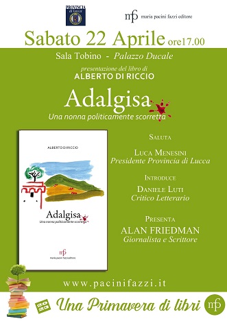 Sarà il giornalista e scrittore Alan Friedman a presentare il volume di Alberto Di Riccio, Adalgisa. Una nonna politicamente scorretta, fresco di stampa per Pacini Fazzi editore. L'evento in programma per sabato 22 aprile alle ore 17 nella Sala Tobino di Palazzo Ducale prevede dopo i saluti del Presidente della Provincia Luca Menesini l'introduzione del critico Daniele Luti che insieme a Friedman presenterà al pubblico, in dialogo con l'autore la figura di nonna Adalgisa e il suo mondo intorno a cui ruota il libro di Di Riccio. Ricordi, profumi, sapori attraverso i quali l'autore ci trasporta sul filo della memoria ai tempi della sua infanzia, nello scenario della campagna lucchese, con i suoi riti, i suoi usi, i tanti mestieri oggi dimenticati. Dai contorni sfumati di vecchie cartoline rivive la figura di Adalgisa, forte ed energica, imperativa e decisa, austera, ma nonna a tutti gli effetti, padrona della cucina e maestra nel realizzare i piatti tipici delle nostre campagne e della nostra tradizione (fra le quali non possono mancare “Le mitiche polpette”) che riassaporiamo nelle belle ricette di cui il libro è arricchito.