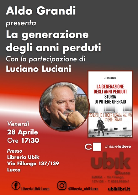 Venerdì 28 Aprile ore 17.30, presso la libreria Ubik Lucca, si terrà la presentazione del nuovo libro di Aldo Grandi "La generazione degli anni perduti" (Chiare Lettere). Con la partecipazione di Luciano Luciani.