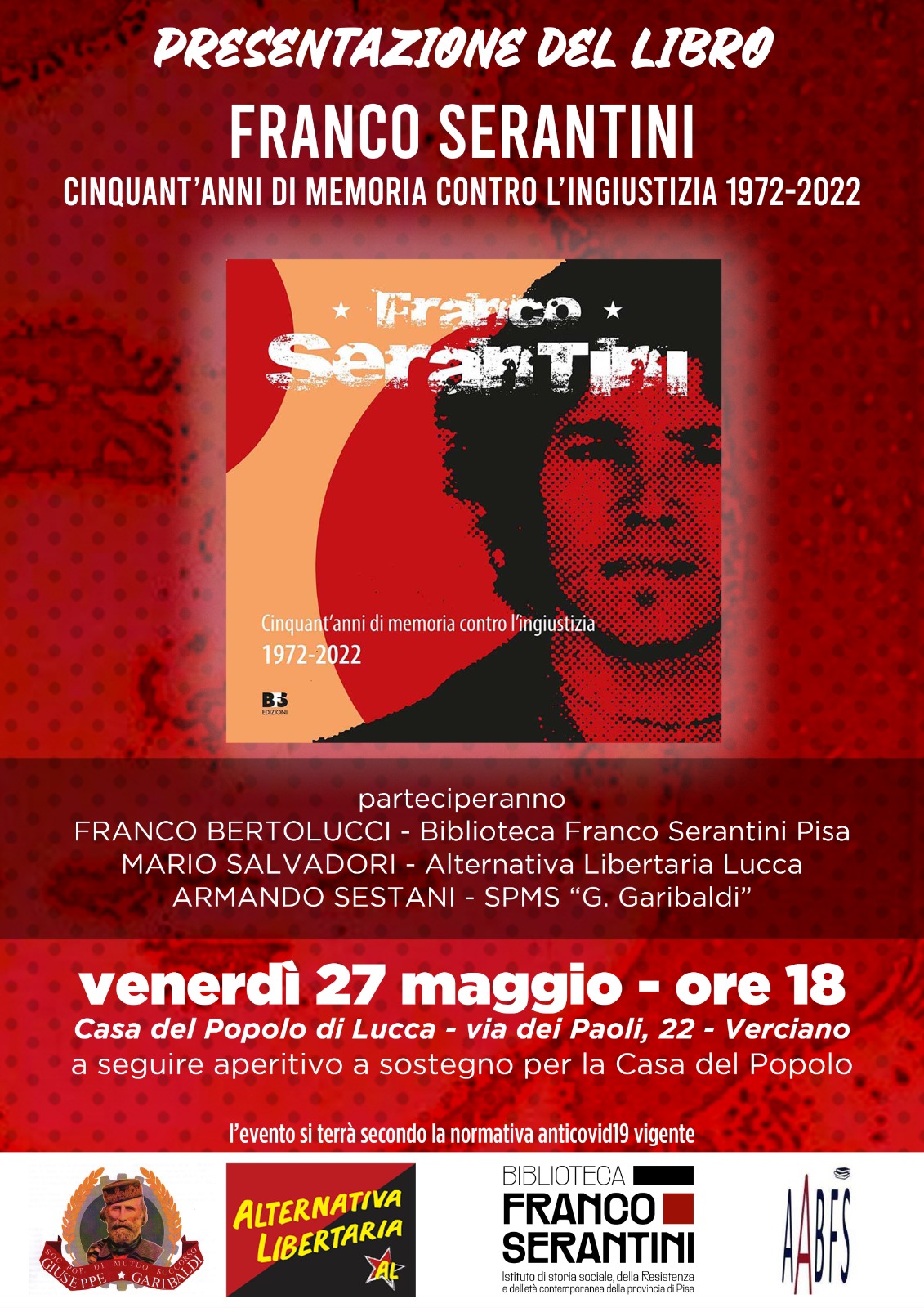 Ne parleranno Franco Bertolucci della Biblioteca Franco Serantini e tra i curatori del libro, Mario Salvadori di Alternativa Libertaria di Lucca e Armando Sestani della Società Popolare di Mutuo Soccorso "G. Garibaldi".