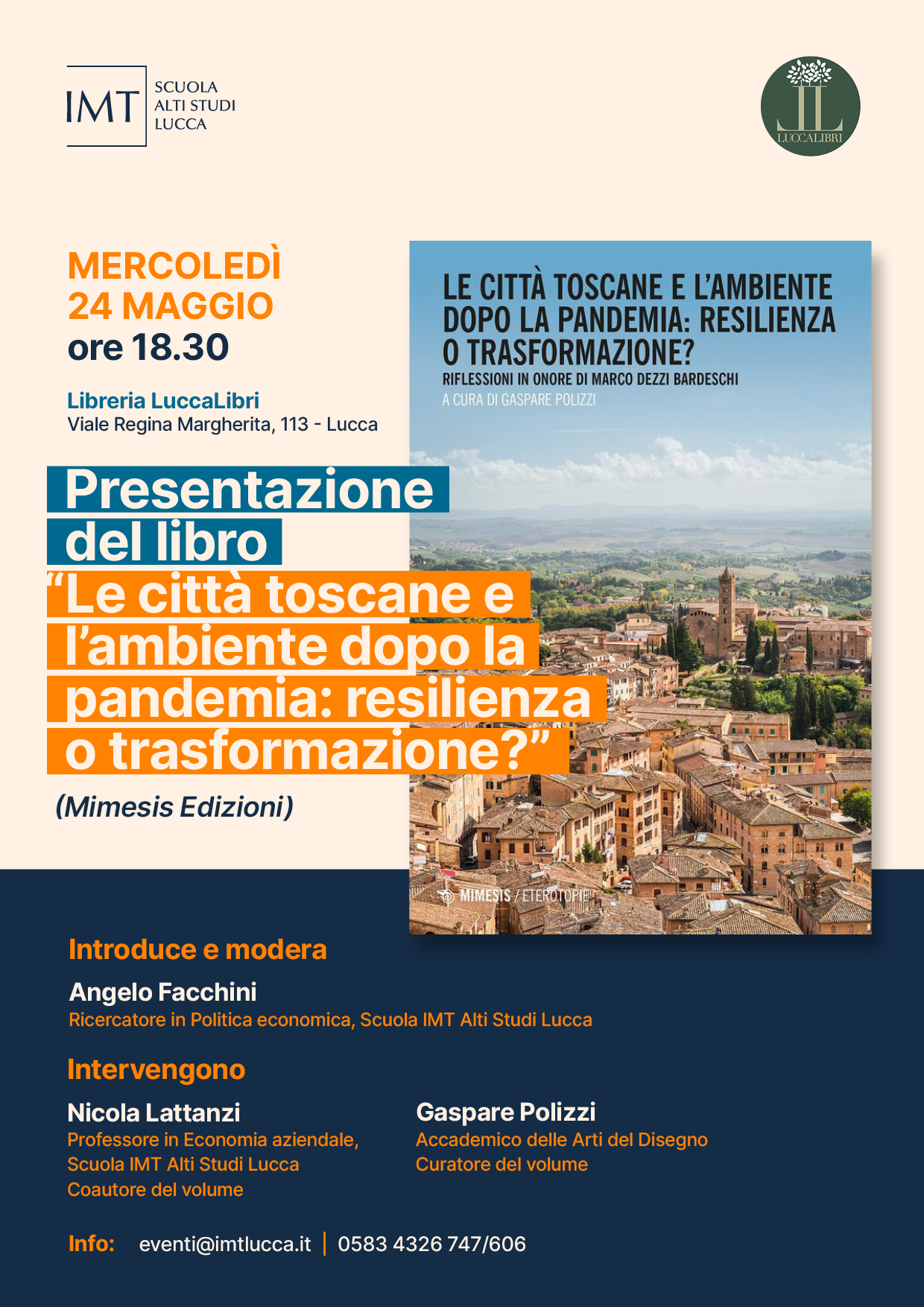 All'evento sarà presente Nicola Lattanzi, professore in Economia aziendale alla Scuola IMT e autore del capitolo intitolato: "La Toscana che guarda al pianeta. Economia, crescita e prospettive dei sistemi urbani".