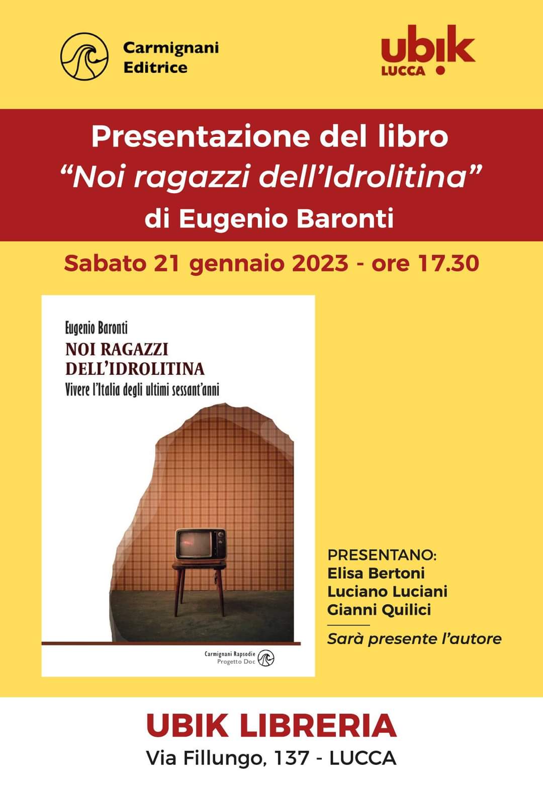 Sabato (21 gennaio), ore 17,30, alla libreria Ubik di via Fillungo si presenta il libro Noi, i ragazzi dell’idrolitina con la presenza dell’autore Eugenio Baronti. A presentarlo saranno Elisa Bertoni, docente al Liceo scientifico “Vallisneri”, Luciano Luciani, critico letterario, che ha dato recentemente alle stampe il romanzo Rossa e plebea. Pisa, mezzo secolo fa, e Gianni Quilici, poeta, scrittore e critico cinematografico.