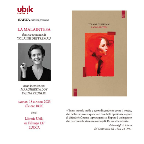 Sabato 18 marzo alle ore 18:00 presso la libreria Ubik Lucca, Yolaine Destremau presenta il suo ultimo romanzo "La malaintesa" (Barta Edizioni) con la partecipazione di Margherita Loy e Gina Truglio.