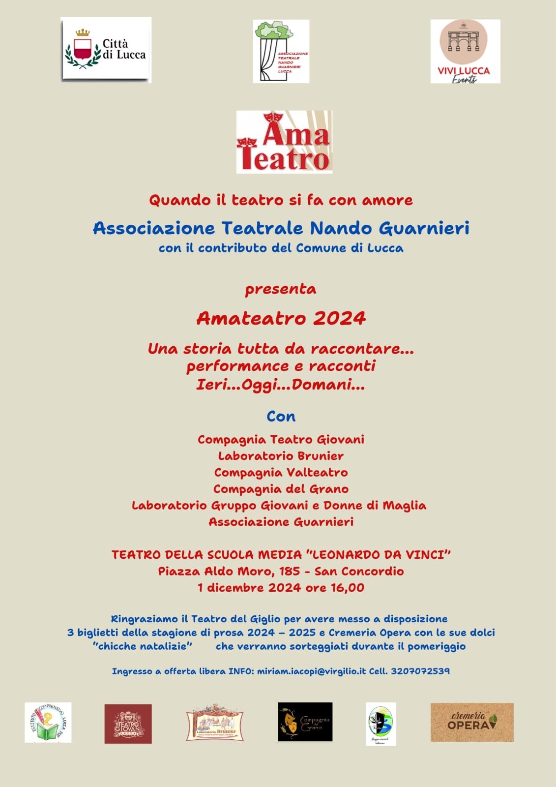 Su queste fondamenta nasce Amateatro oggi presente grazie alle compagnie, ma sopratutto a figure di spicco del teatro lucchese come Anna e Angelo Fanucchi. Il ringraziamento, continua Miriam, va al nostro Presidente Emilio Micheletti che da ieri a oggi con costanza e determinazione è sempre riuscito a rendere Amateatro una realtà viva e attenta alla contemporaneità e al territorio. La scelta di coinvolgere le Scuole non è casuale, i giovani al primo posto come le nuove proposte. In questo ringraziamo il Comune di Lucca che ci ha dato sempre il giusto appoggio. Una storia tutta da raccontare, per questo motivo Amateatro sarà un momento in cui ci racconteremo tra performance, ricordi e nuove prospettive verso un 2025 scoppiettante.