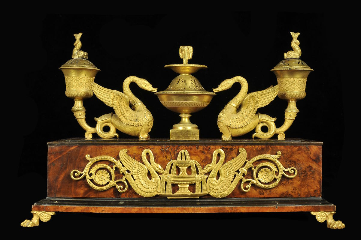 “La nuova moda alla francese imponeva di arricchire il mobilio con ricchi ornamenti in bronzo dorato, i cui modelli provenivano quasi certamente dalla Francia. Il calamaio, donato dagli Amici dei Musei di Roma al Museo Napoleonico nel 2013, si presenta come opera di raffinata manifattura sia nell’uso della radica di olmo con finiture in ebano sia nella complessa decorazione in bronzo dorato. Un elegante e sinuoso movimento lega i due vasetti per l’inchiostro e la polvere d’argento sormontati da delfini con due figure di cigni che si abbeverano a una coppa chiusa da un coperchio che ne ribalta la forma. La specularità della composizione nel gioco alto e basso degli elementi ne rivela la completa maturità di stile. Nel fronte, la decorazione ripete l’immagine dei cigni mentre si abbeverano ad una zampillante fontana, perdendo nella bidimensionalità un po’ della sua leggerezza. La conferma che questo calamaio sia stato commissionato da Elisa per la Villa Reale di Marlia viene da una circostanza precisa: esso compare, infatti, in una fotografia di un salone della Villa acquistata con tutti i suoi arredi nel 1923 dai Pecci Blunt e pubblicata nell’articolo di Eveline Schlumberger, Un palais décoré par Elisa Bonaparte in Connaissance des Arts (n. 66, 1957, pp.48-53).”