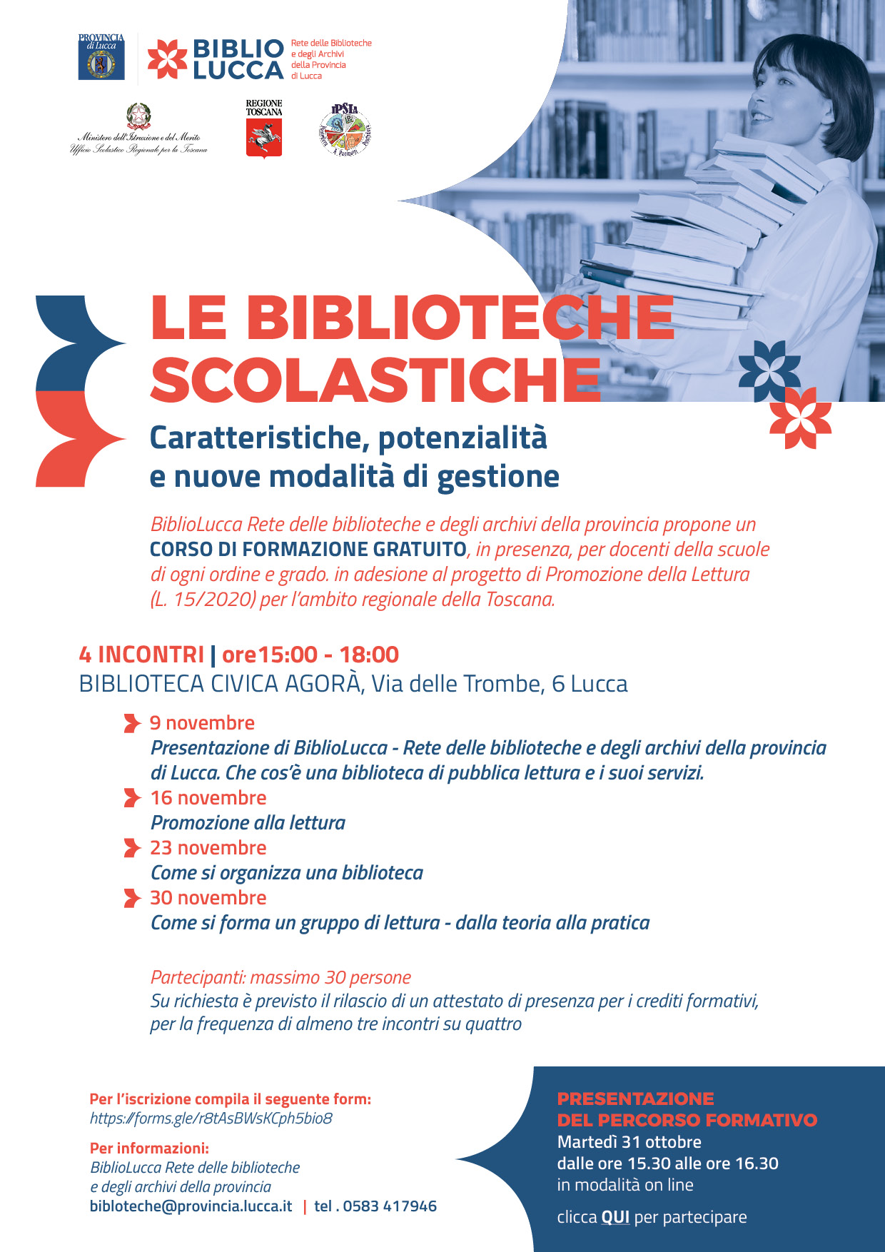 Anteprima di presentazione online, martedì 31 ottobre alle 15:30, per il corso di formazione gratuito per docenti delle scuole di ogni ordine e grado, 'Le biblioteche scolastiche - Caratteristiche, potenzialità e nuove modalità di gestione', curato e organizzato da BiblioLucca, rete delle biblioteche e degli archivi della provincia di Lucca, che si svolgerà all'Agorà di Lucca.