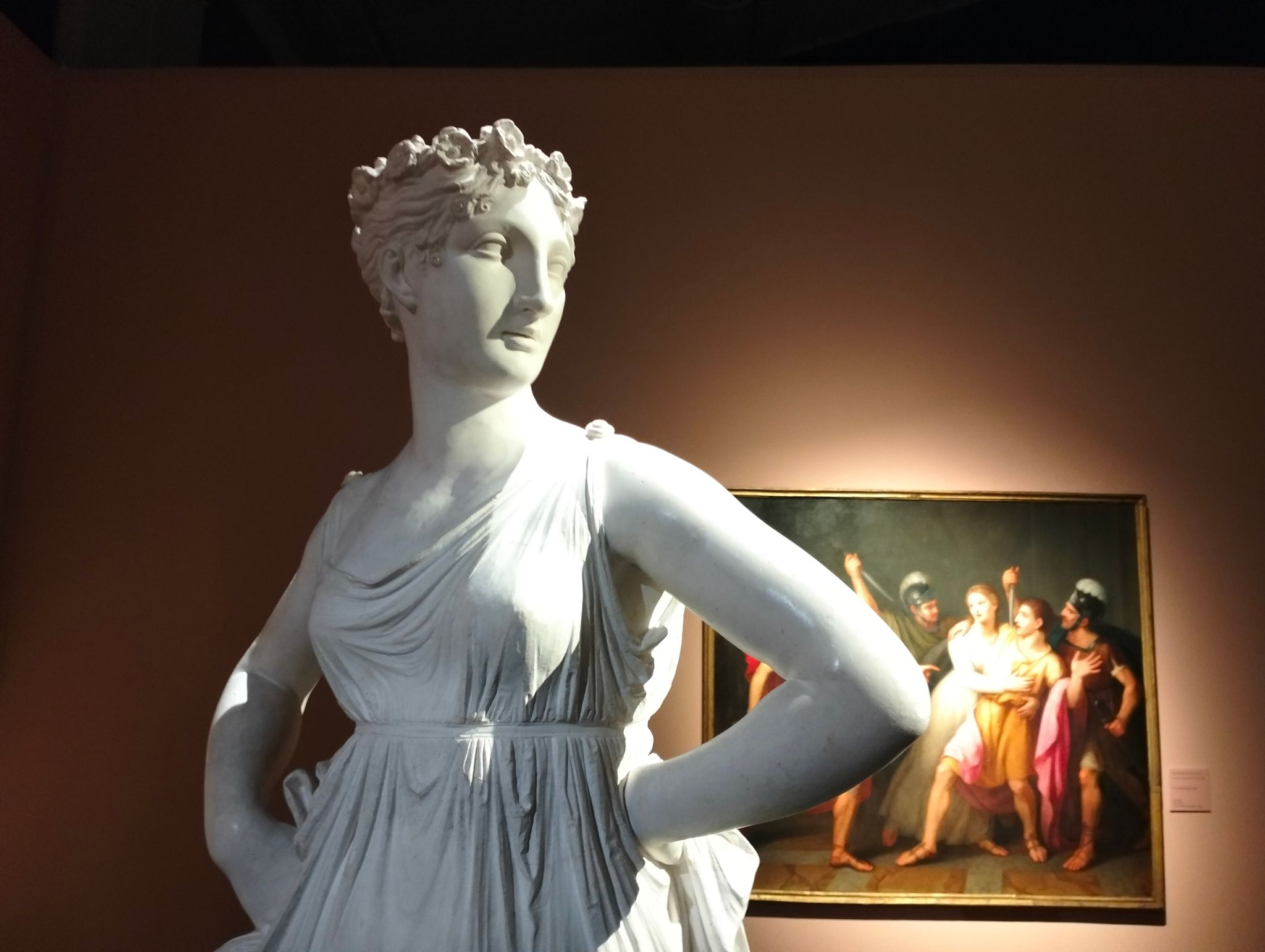 Le statue del maestro di Possagno dominano la scena. Con la loro lucentezza e il loro candore illuminano la sala come un faro nella notte. I quadri appesi alle pareti, sembrano godere di luce riflessa. Sembra una gipsoteca. Un atelier, un laboratorio, uno studio. La rievocazione di un mito antico che, in quanto classico, non tramonta mai. E ci parla pure oggi. Soprattutto, oggi.